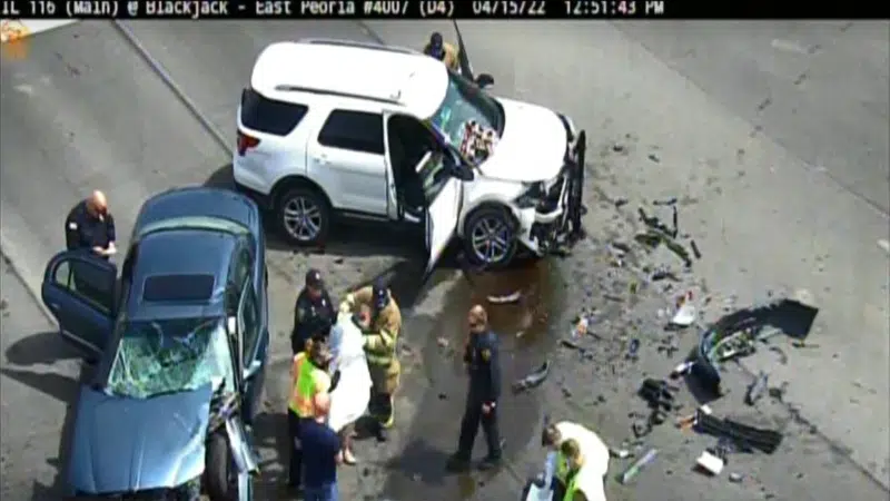 25 News reports the crash happened in the noon hour at Main and Blackjack. IDOT traffic cameras clearly showed, at one point, a naked man leaning on a blue car that collided with an SUV.