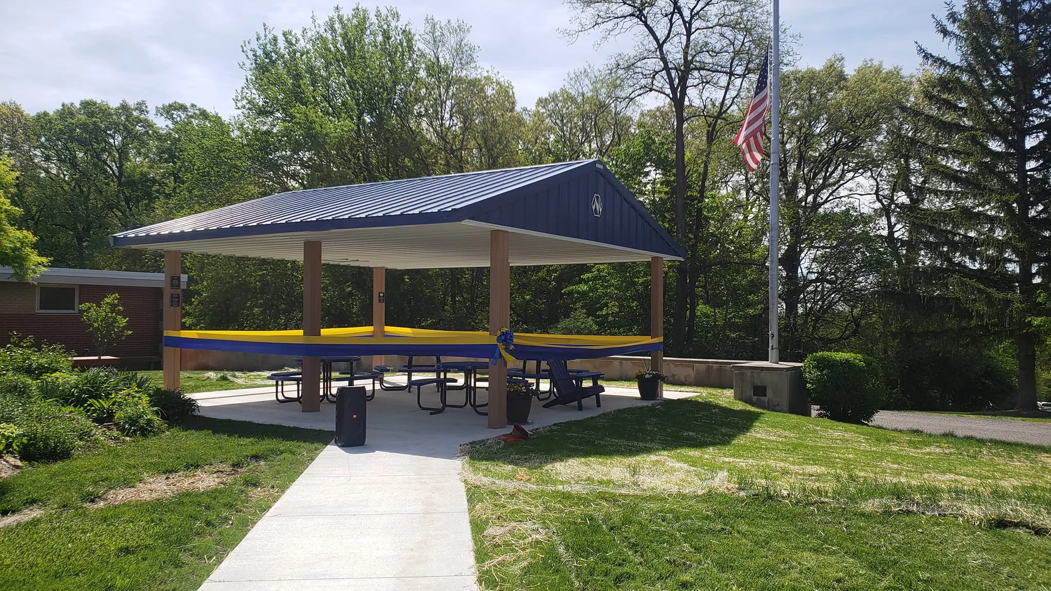 The Outdoor Classroom includes a covered seating area with Adirondack chairs and additional seating, as well as several picnic tables with umbrellas nearby.