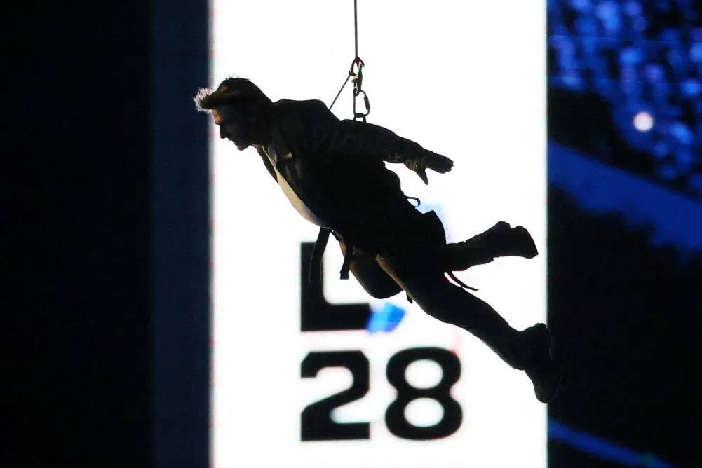 Grammy-winning R&B artist H.E.R teased the Mission Impossible soundtrack as Cruise made his leap, drawing gasps from spectators as he dropped 50 meters to the floor of the Stade de France, in the finale to a ceremony that blended the traditional, the obscure and the razzle dazzle of Tinseltown.