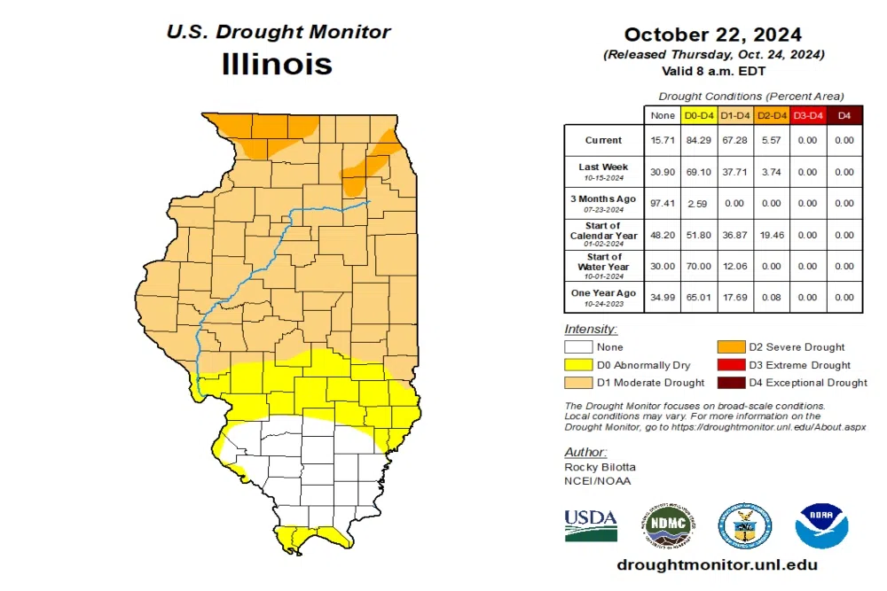 All of Tazewell and Woodford Counties were at 100% drought last week, with only around 56% of Peoria County in moderate drought the week prior.