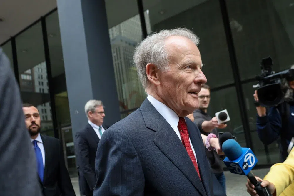 Surrounded by media, former Democratic House Speaker Michael Madigan, the longest-serving legislative leader in U.S. history, departs the Dirksen Federal Courthouse on June 13, 2025, after receiving a 7 ½-year prison sentence on corruption charges. He was also fined $2.5 million. (Capitol News Illinois photo by Andrew Adams)