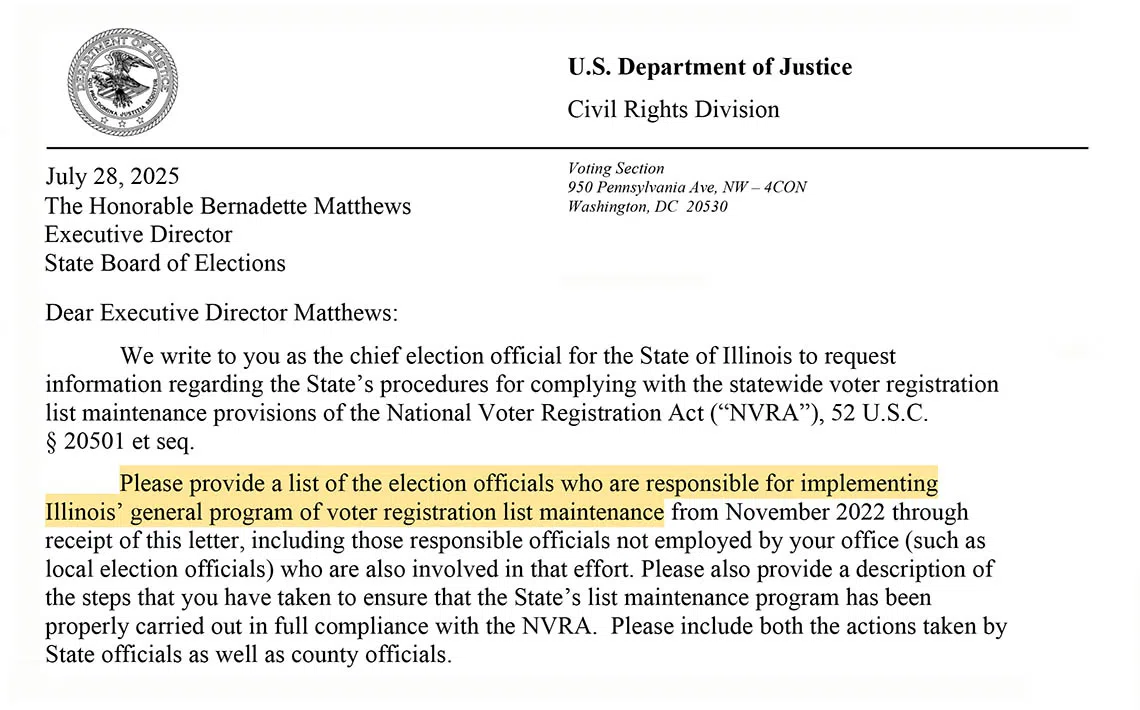 In a letter dated Monday, July 28, lawyers from the U.S. Department of Justice’s Civil Rights Division also asked for a list of all the election officials in Illinois who were responsible for carrying out federally mandated efforts to keep state’s voter rolls accurate and up to date during a two-year period leading up to the November 2024 elections.