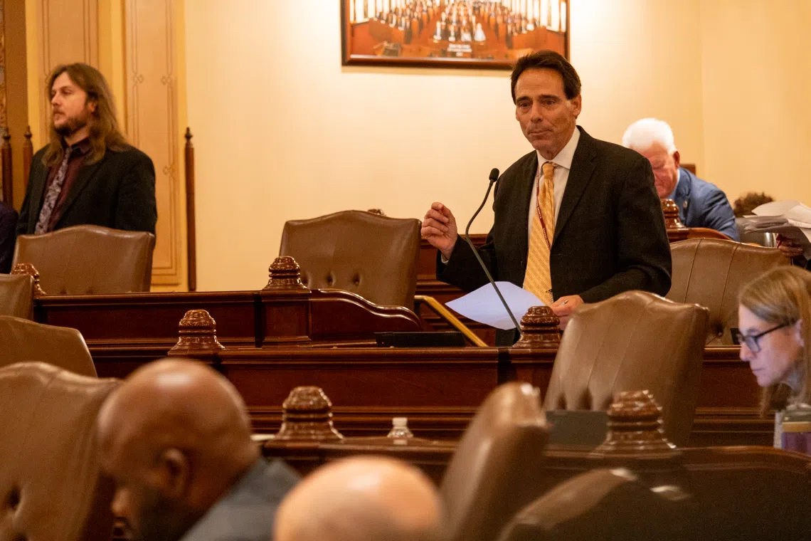 Sen. Steve Stadelman, D-Rockford, defends his energy legislation on the Senate floor on Oct. 30. (Capitol News Illinois photo by Andrew Adams)