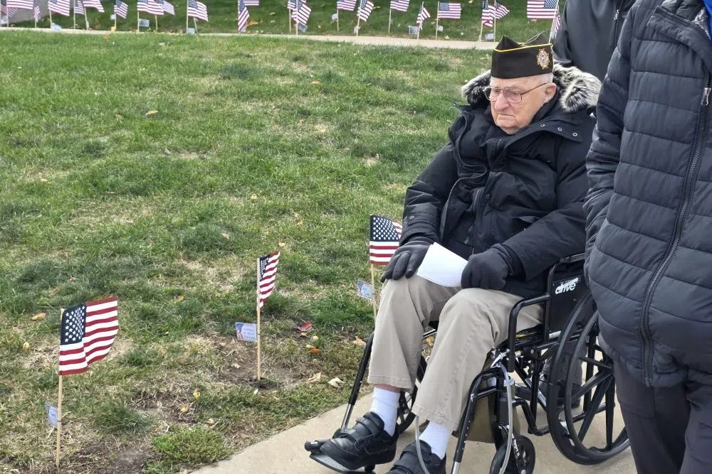 The ceremony also included a $1,000 donation to the Greater Peoria Honor Flight from students who sold flags with the names of veterans on them.