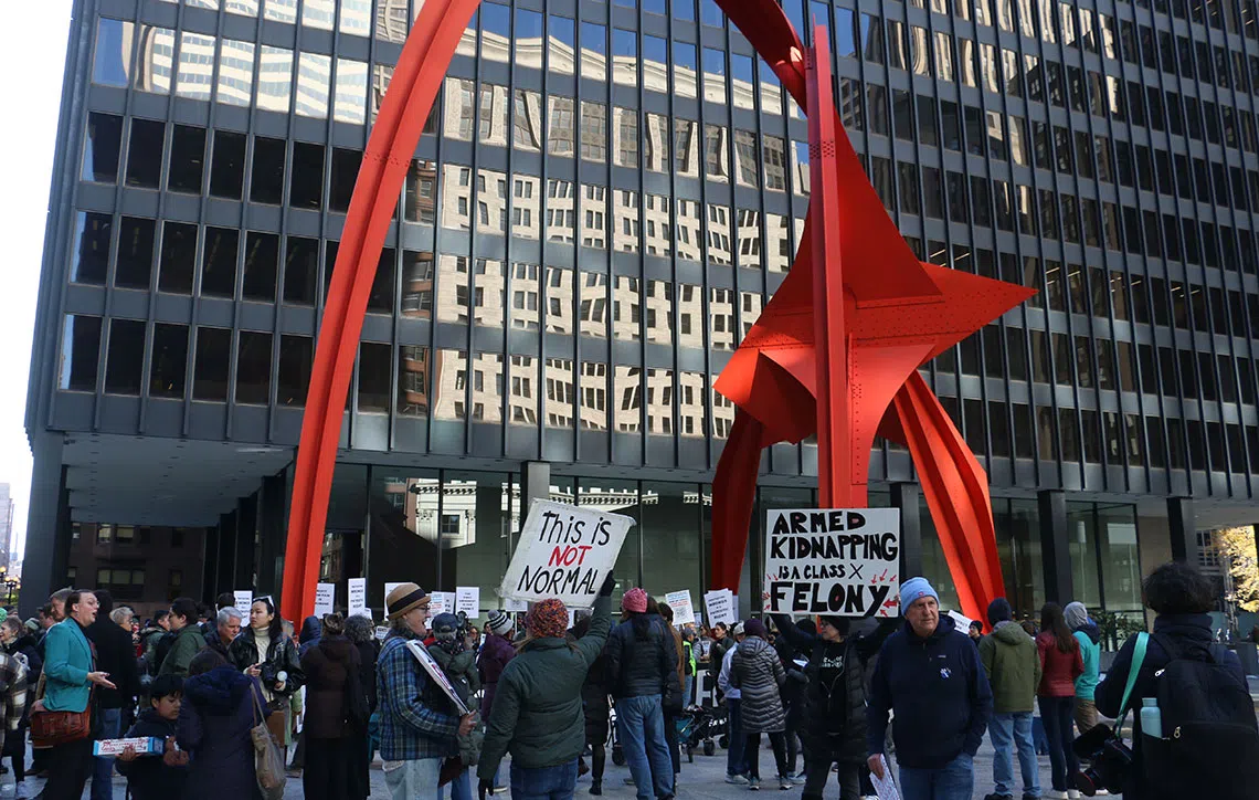 Protesters gather at Federal Plaza on Nov. 12 to show their support for the ‘Broadview Six.’ (Capitol News Illinois photo by Maggie Dougherty)