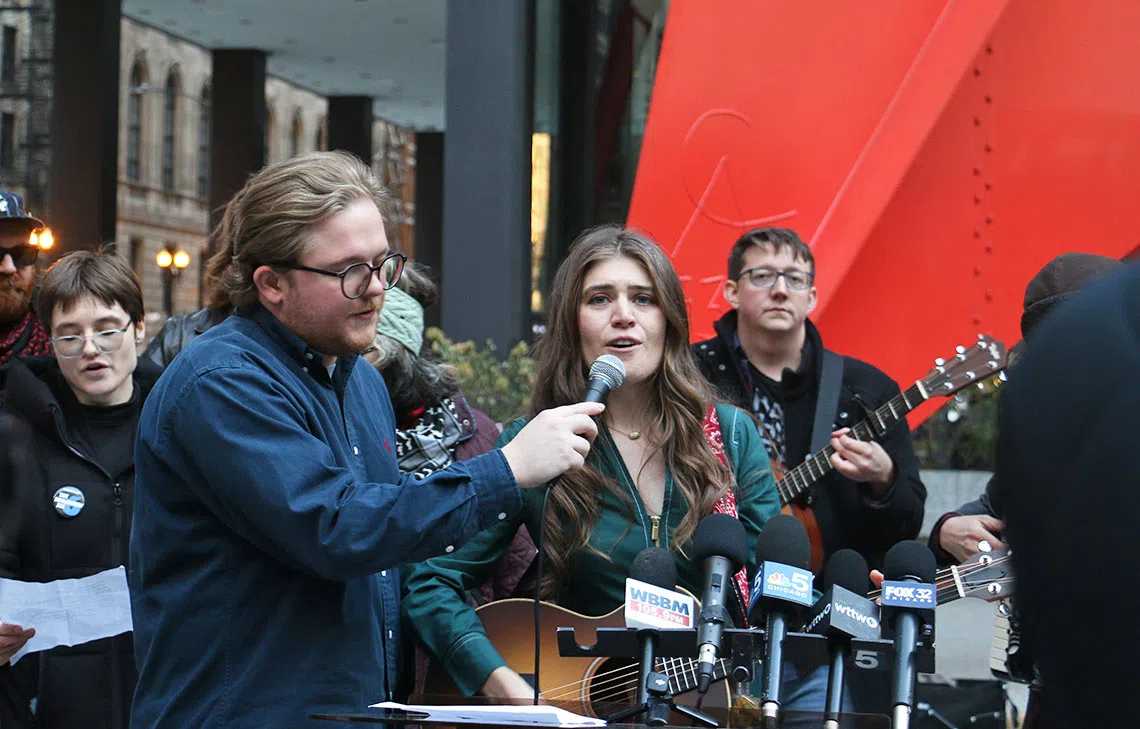 Joselyn Walsh, one of six people facing federal charges related to protest activity at ICE’s Broadview facility, plays music with supporters after her arraignment hearing on Nov. 12. (Capitol News Illinois photo by Maggie Dougherty)