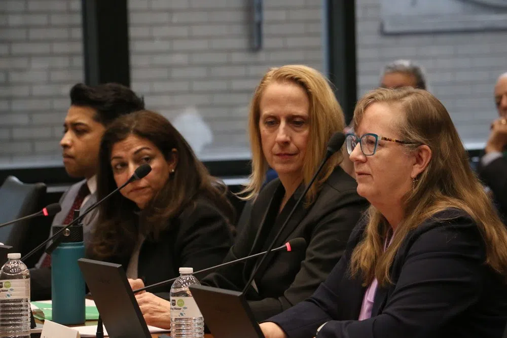 Pediatric care providers testify at the Feb. 24, 2026, hearing of the Illinois Accountability Commission about the health impacts to immigrant children amid Operation Midway Blitz. From left: Minal Giri, Rebecca Ford-Paz and Karen Susan Haverkamp. (Capitol News Illinois photo by Maggie Dougherty)