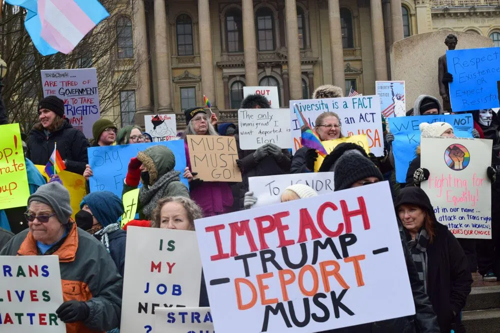 Julia Bradley Dec 01, 2025 Protesters hold up signs at a rally outside the Illinois Capitol in January 2025 protesting federal government cuts pushed by President Donald Trump and Elon Musk. (Capitol News Illinois photo by Jade Aubrey)