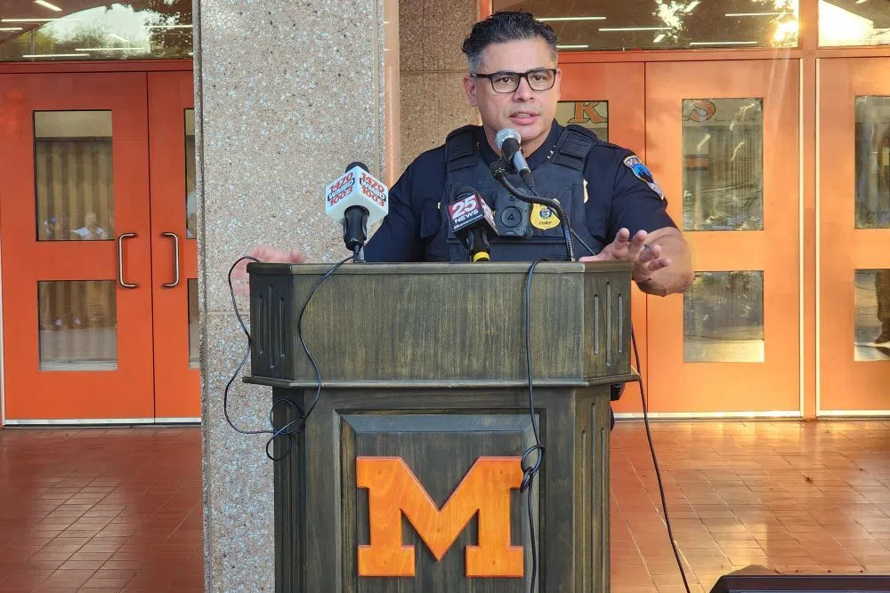 TJ Carson Aug 27, 2025 Peoria Police Chief Eric Echevarria speaks at Manual High School before volunteers greet students starting a new school week. (T.J. Carson/1470 & 100.3 WMBD)