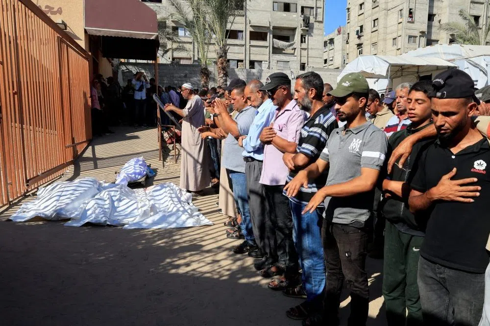 TJ Carson Jun 26, 2025 Mourners pray as they attend the funeral of Palestinians killed, in what the Gaza Health Ministry said, were overnight Israeli airstrikes on tents sheltering displaced people, at Nasser hospital, in Khan Younis, southern Gaza Strip, June 26, 2025. REUTERS/Hatem Khaled