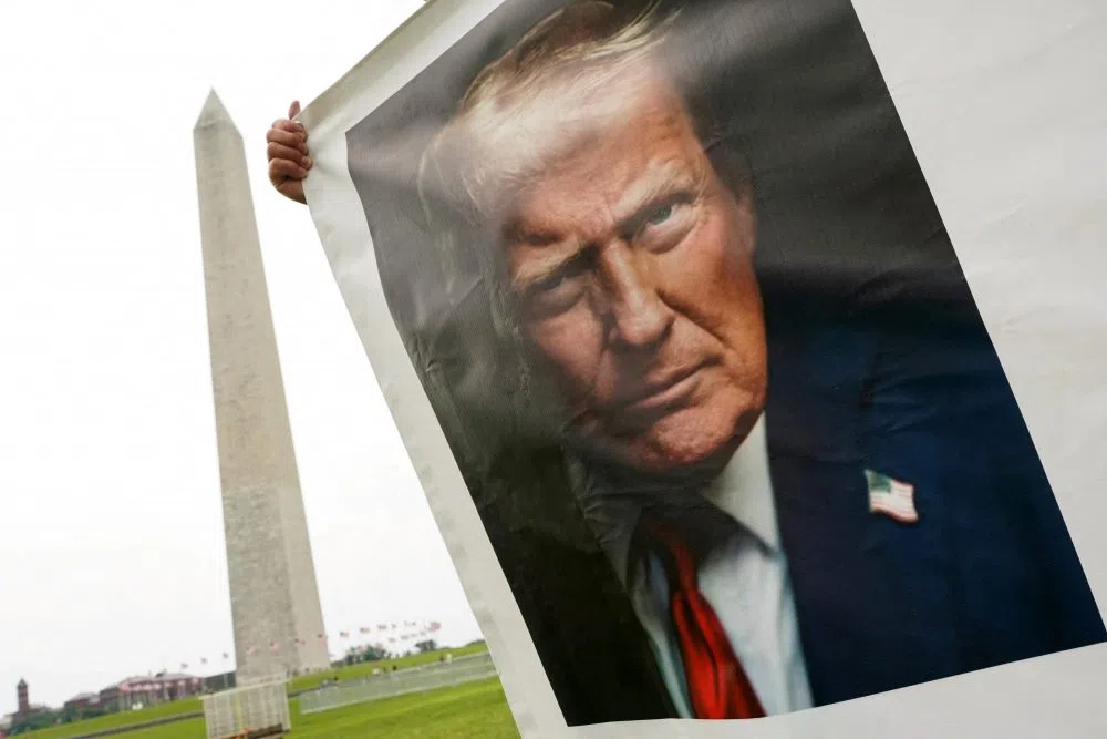 Ed Hammond Jun 14, 2025 A supporter holds a banner with U.S President Donald Trump's picture near the Washington Monument, ahead of the upcoming U.S. Army 250th anniversary celebration parade, in Washington, D.C., U.S., June 13, 2025. REUTERS/Nathan Howard