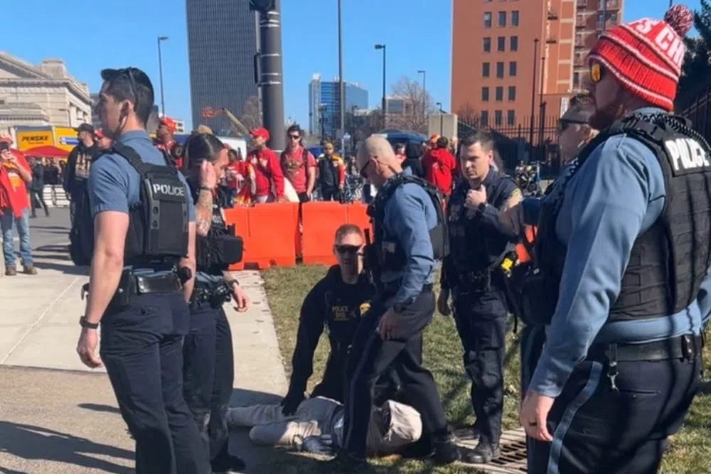 Will Stevenson Feb 20, 2024 FILE PHOTO: Police officers detain a person outside of Union Station following a shooting near an outdoor celebration of the NFL champion Chiefs' Super Bowl victory, in Kansas City, Missouri, U.S. February 14, 2024 in this screen grab obtained from social media video. Alyssa Contreras/via REUTERS/File Photo