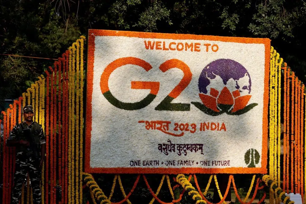 Julia Bradley Sep 08, 2023 A security force personnel stands guard next to a hoarding decorated with flowers on a pavement ahead of the G20 Summit in New Delhi, India, September 8, 2023. REUTERS/Amit Dave